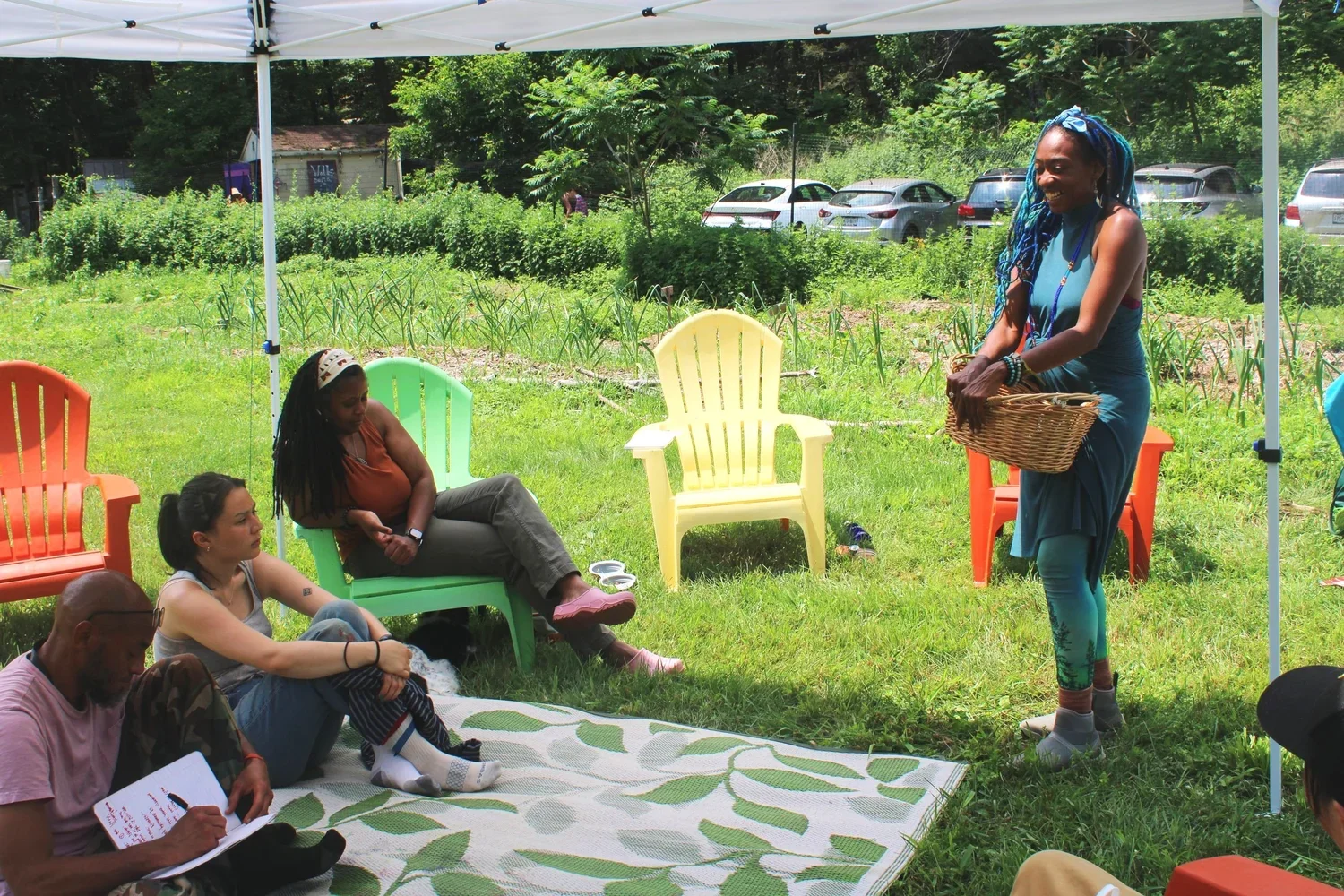Session #2: Getting grounded and offering the group context around cotton, the garden space, and our experiences with cotton before jumping into the crafting component. (Photo by Corey)