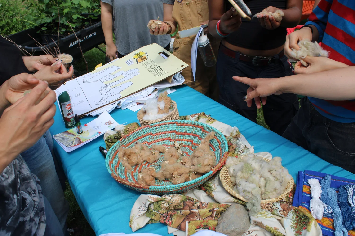 Session #1: Participants engaging with various types of cotton bolls (grown in Brooklyn by Maya the year prior) and materials as we transition to lunch.