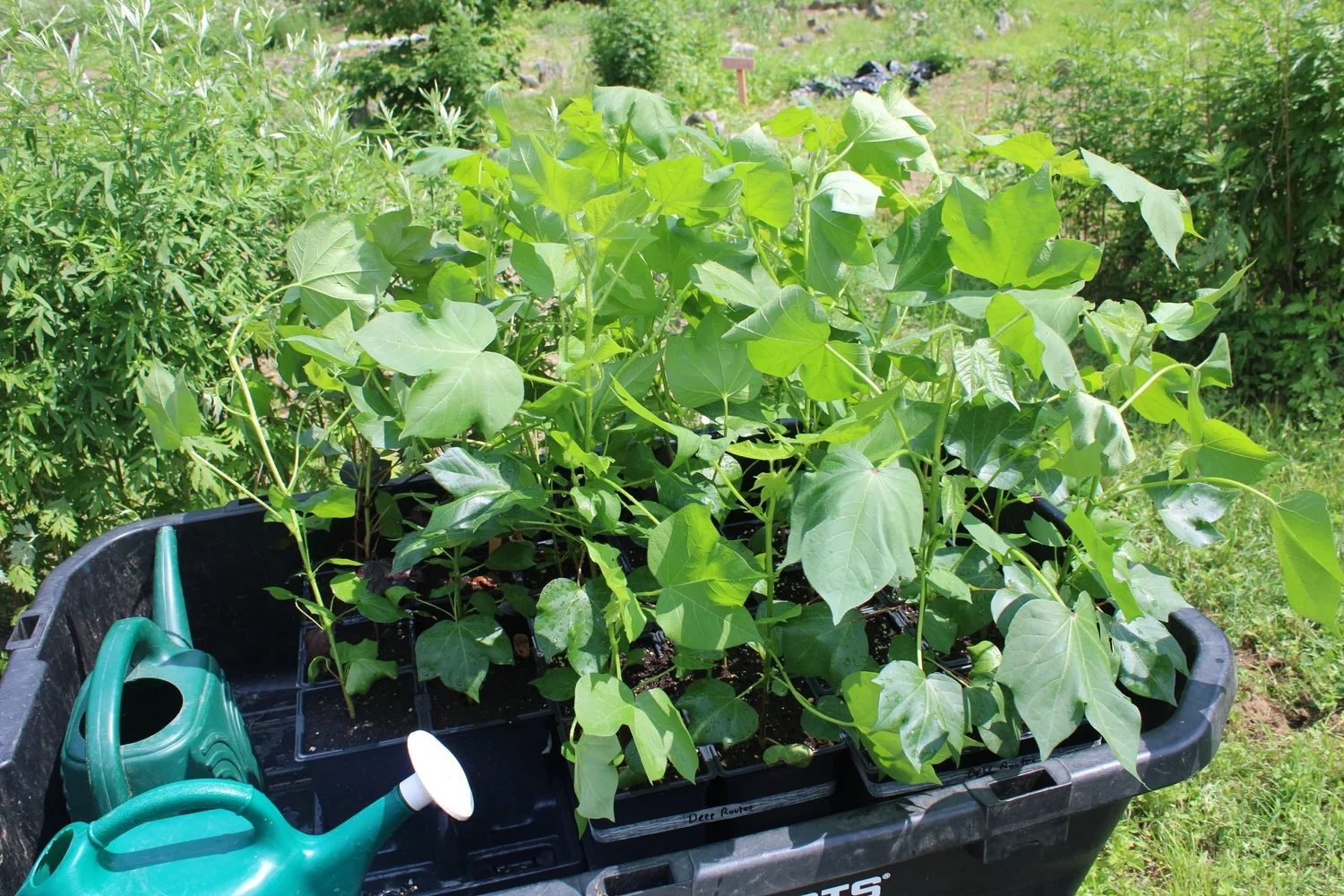 Session #1: Cotton seedlings Ashni and Maya sowed in Brooklyn in March 2025, Maya stepped up/potted up in May, and we would be transplanting into the soil at Mumbet’s Freedom Farm during the session.